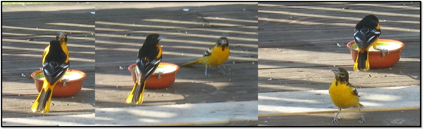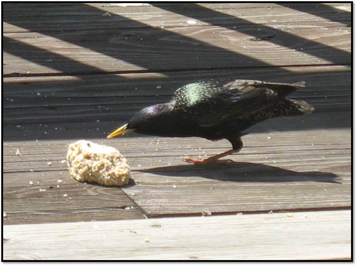 2. When I put a little suet on the deck floor to help feed the local one-legged European Starling, more Orioles appeared that ate both the suet and the grape jelly.