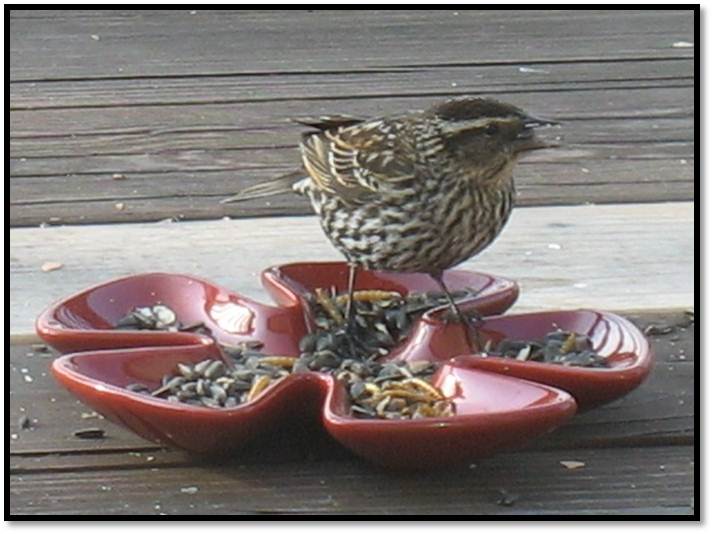 The female Red-winged Blackbird pictured below is not a new customer, but since she was really showboating on that tray of seeds when I was snapping the other pictures, I am giving her a guest appearance in this post. I can take a hint!