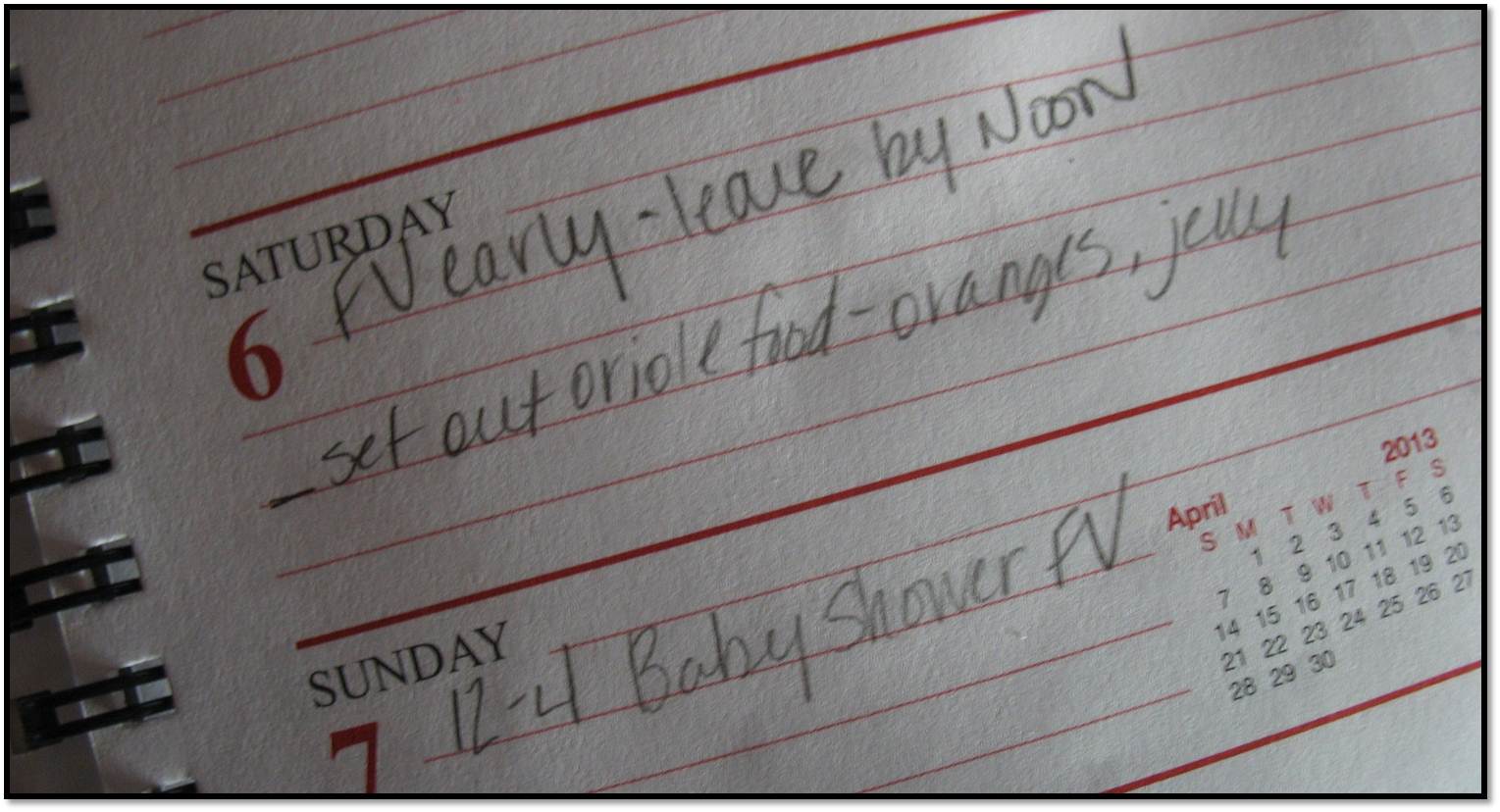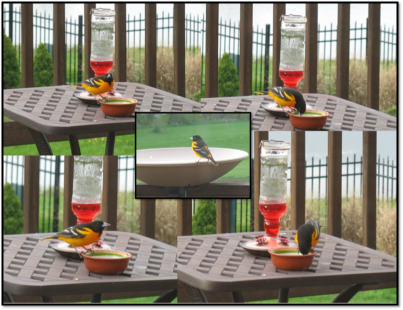 Days and weeks had come and gone without Orioles. Andrea had some explaining to do. All the grape jelly seemed to summons was rain, a lot of rain. I know, April showers and all, but still, it was aggravating to put out fresh dishes of jelly only to be left with purple water hours later. And no Orioles.