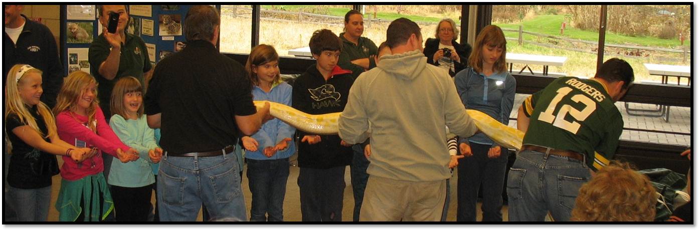 I don’t know if blondes have more fun, but I know that Blondie, an Albino Burmese Python, had no issues with being lifted up by three strong men and stretched out to be held by about 20 eager little arms.