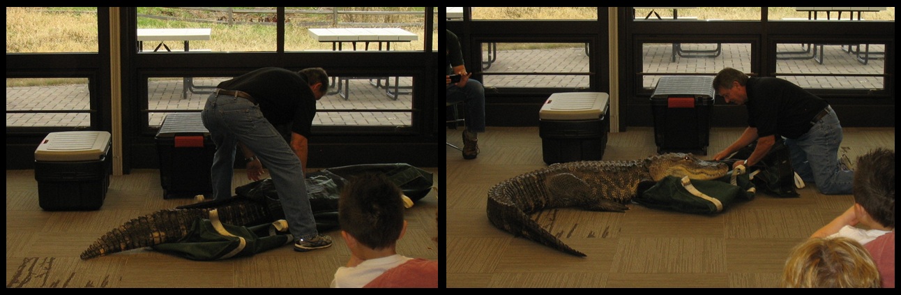 Once Jim arrived, he started to bring his creatures around the side of the building. He got some assistance moving many yet-to-be-identified guests into the presentation room in addition to his alligator “Bubba ” (the sequel). Joel, who loved alligators as a tot, was one of the guys who helped grab a handle to carry the gator. Now if anyone ever compares the weight of something to an adult alligator, he’ll know exactly what they’re talking about! This is just one of the super-cool benefits of being a volunteer – or even the spouse of a volunteer! You NEVER know what you might closely encounter!