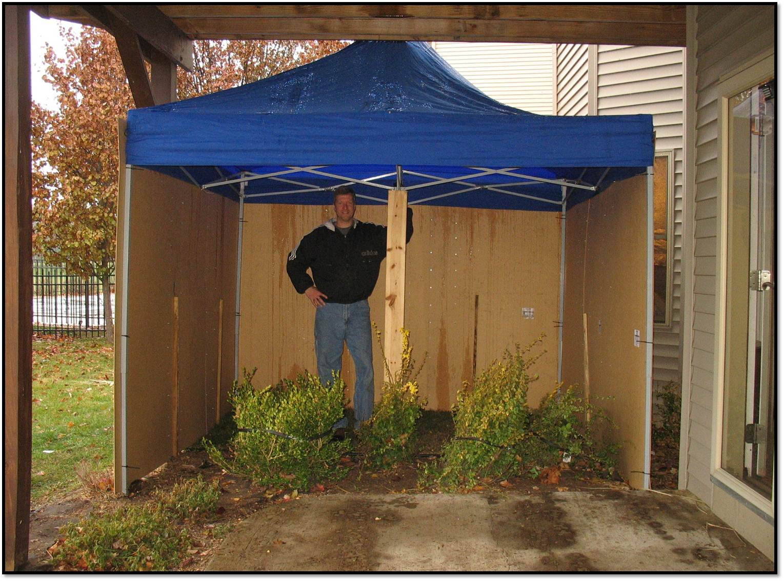 Confirming our plan: We put up the tent and picked out what we believed would be the best spot. We considered the distance from the door to the house and direction of wind.