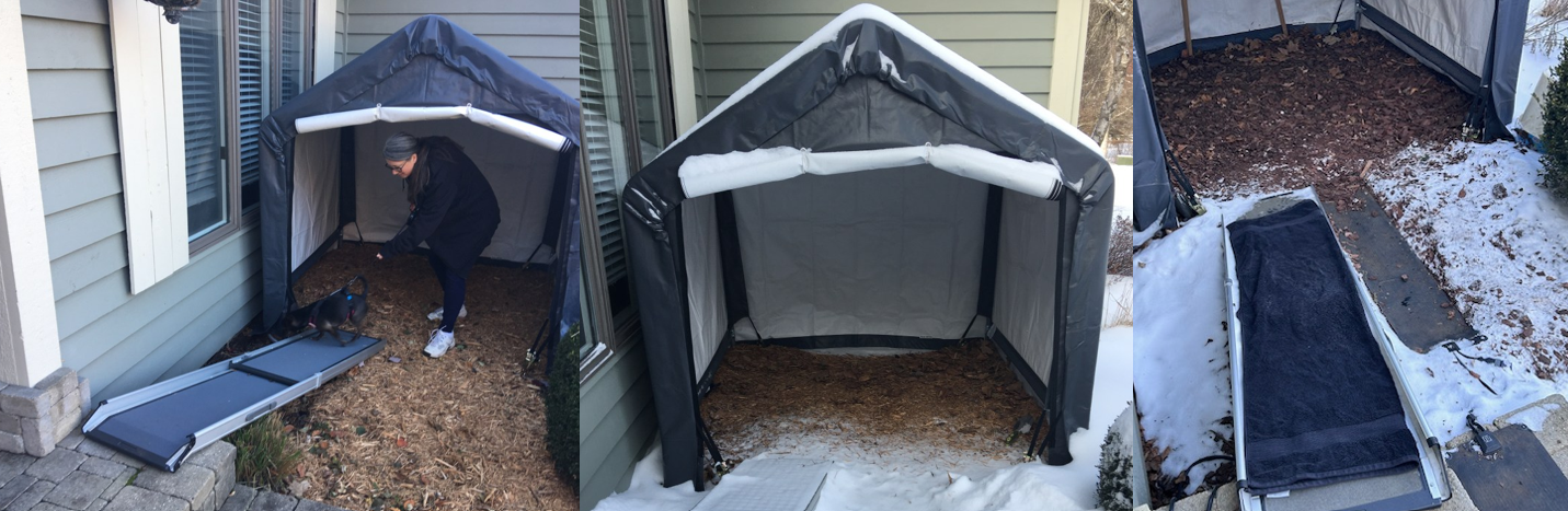 This is what we currently have outside year-round – a 6×6 outdoor shed from Shelter-Logic used as a covered potty area. This is well worth the price for the convenience! Five years later, it’s like renting it for about $10 a season! What a great value to avoid shoveling, high winds, and rain while also providing quick and easy access for a fussy or senior dog to do their business outside!
