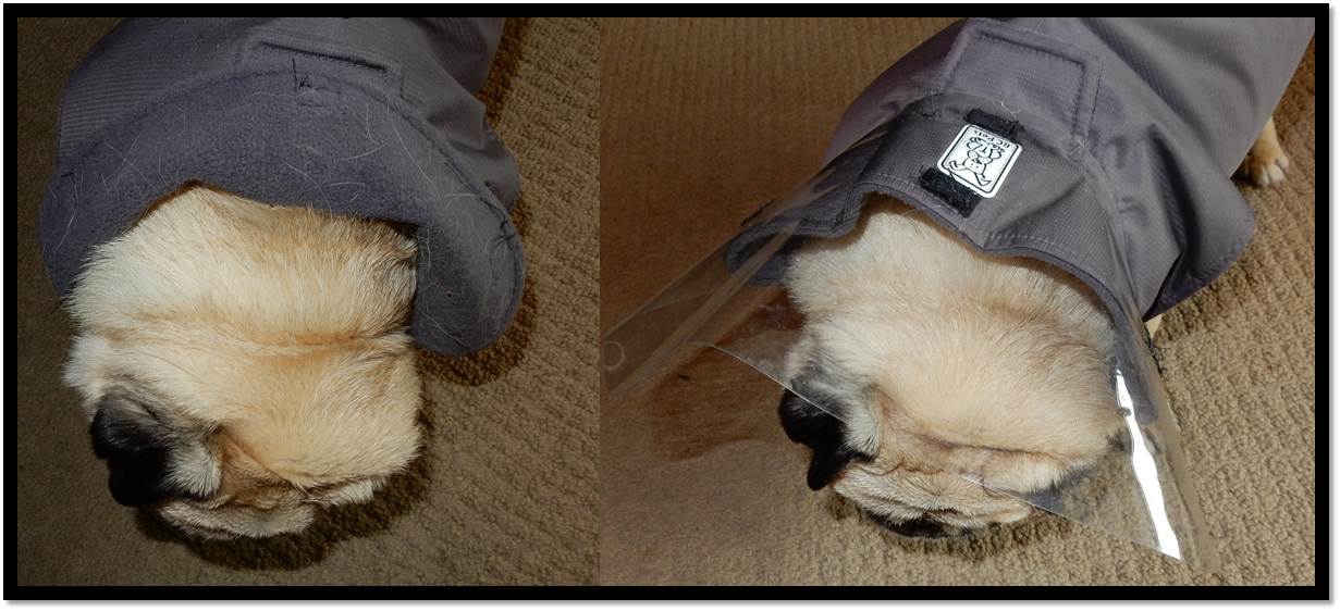 A few years after I made my winter coat, I discovered this one by RC Pets purchased from Healthy Pet in Aurora, IL that is really close to what I had been originally searching for. Even though Peanut is petite for a pug, she is a size 14, so a bit larger than the total sizing and weight would suggest. It’s warm and attaches easily with velcro. As a bonus, it is also water resistant. In an “if-only-it-kept-the-rain-off-her-head-too” train of thought, I came up with a way to attach a rain visor to the collar.