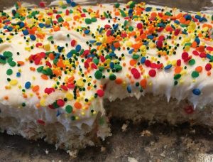 …these were along the lines of what I’d been searching for last weekend when I could no longer wait to make a vanilla-flavored, vanilla-frosted confetti cake mix purchased a few weeks ago. The dairy-free mix called for oil, water, and three eggs. I hardly ever bake, and don’t recall the last time I tried to replace three eggs in a recipe (or with what) but that would be a problem for future-me!