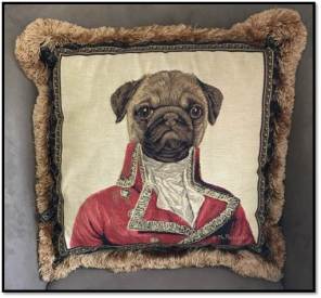 While The Feathered Nest page is about bird-inspired décor, pug style dominates the home office. It all started with a single pillow embroidered with a pug in a General’s coat. It didn’t go with anything and I had nowhere to put it, but still, I just had to have it because…pug.