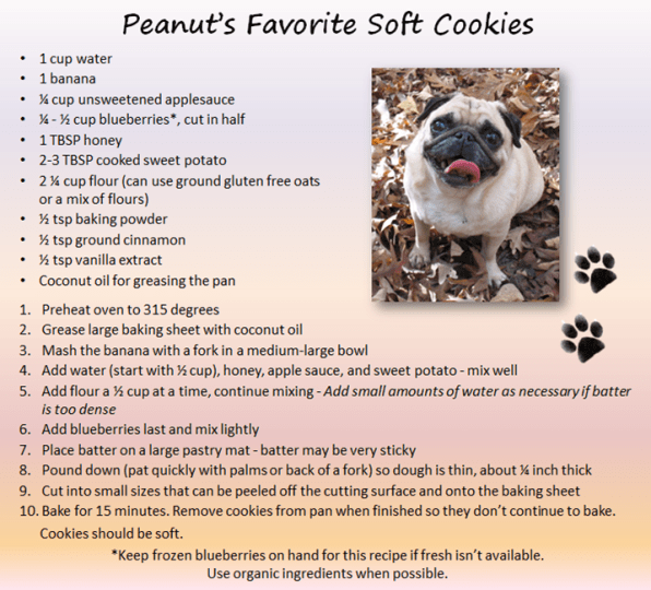 We naturally assumed that Peanut would enjoy dessert after dinner just like we did, so for a while we’d give her treats like ice cream for dogs and little samples of whatever we were having (excluding toxic foods dogs should avoid, like chocolate). Over time I stopped giving her the dog ice cream because of too much sugar or other ingredients I didn’t think she needed. Rather than try my hand at making ice cream, I looked at ways to make healthy cookies instead. I found a homemade cookie recipe on Pinterest that I tweaked to fit the bill. It contains healthy fruits and sweet potatoes, and remains very soft – perfect for buddies who may have dental issues or just prefer soft treats.