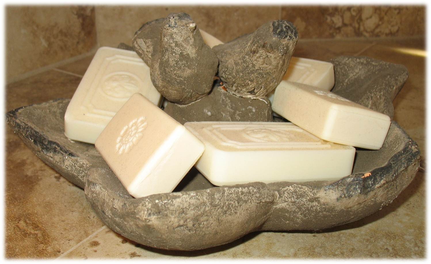 Originally purchased to hold seed or water, I decided that this bird bath was probably too flaky and delicate to clean frequently from outdoor use. I happened to have a box of pretty soaps that needed somewhere to be displayed, so in they went. Perfect!