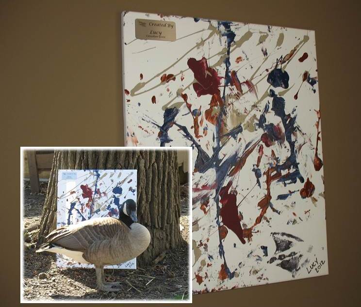 Having placed the winning bid for a Lucy original, we are the proud owners of a painting by a Canada goose/education animal ambassador from the Fox Valley Wildlife Center in Elburn, IL. This is no ordinary goose! (Bird photo credit: Brittney VH)