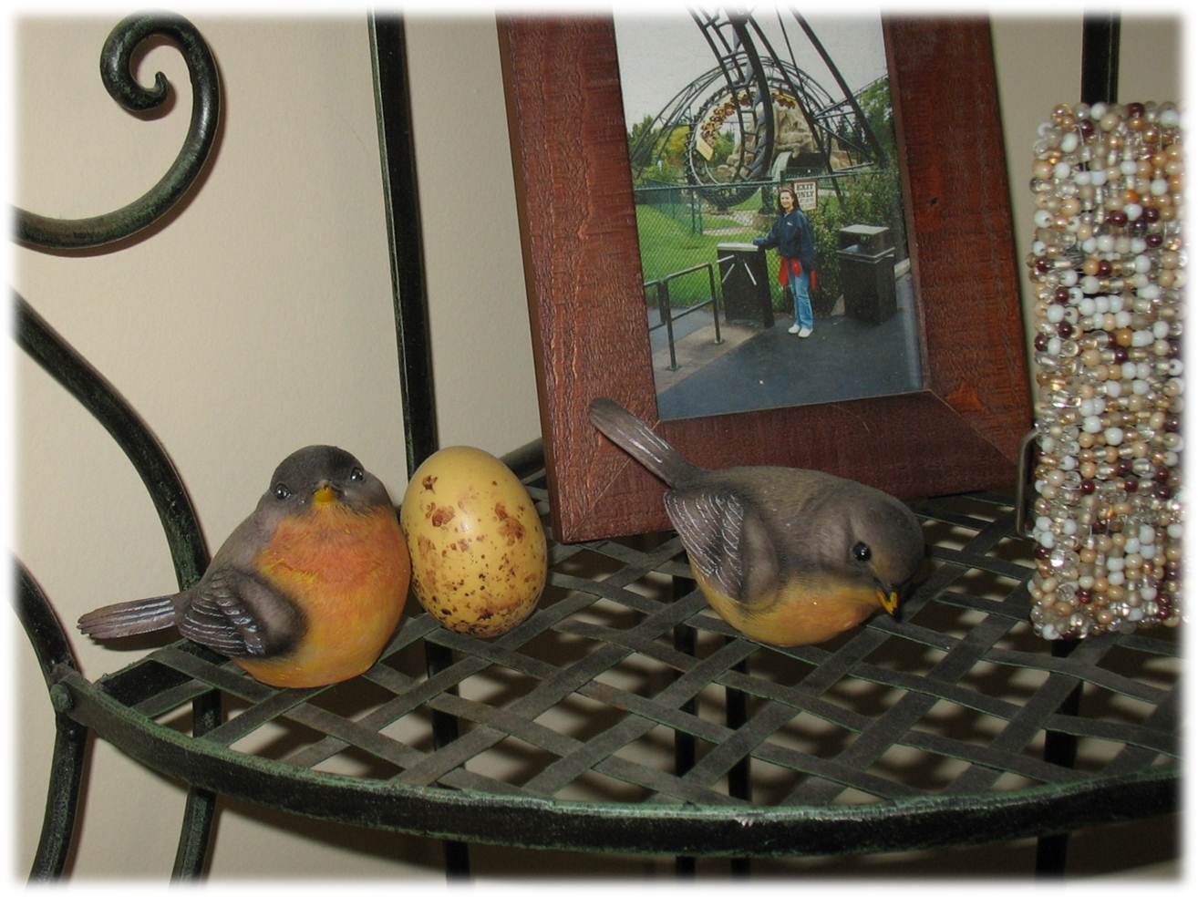 I left a small craft mall in Peoria, IL with several of these little painted birds that perch on shelves of a corner unit. The eggs are an addition from a boutique craft store.