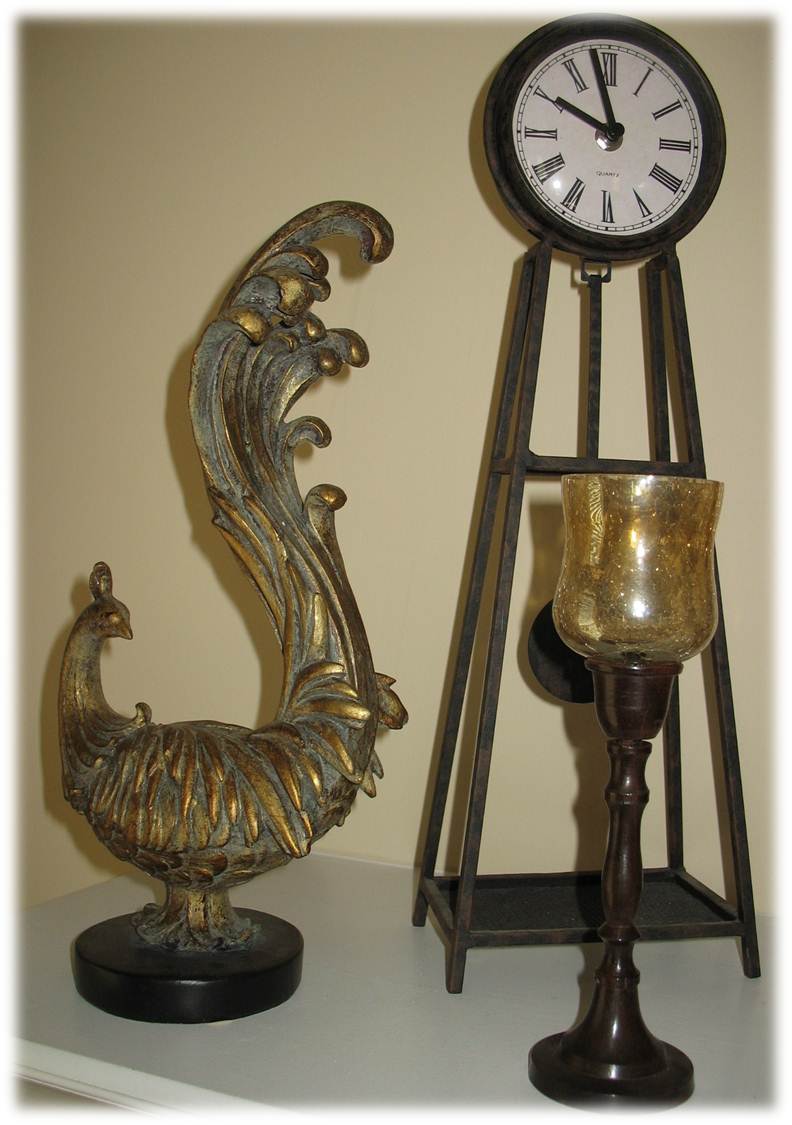 This collection rests at the end of the mantle over the fireplace. I like the elegant sweep of the tail and the softness it brings to the space. All three items purchased from Hobby Lobby.