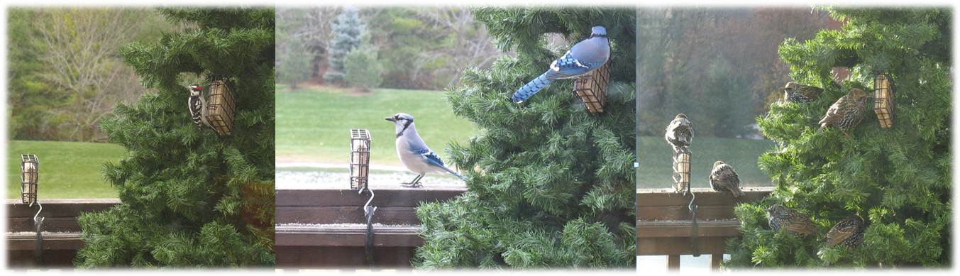 The inside of the house is nearing capacity for what I’d consider still tastefully birdy. Moving things outdoors, I bought a large artificial Christmas tree from Goodwill for our deck. The intention is to provide some cover and instant hiding spots from any hawks in the area looking for a meal. I would never otherwise deny a predator from catching its prey (the hawk has to make a living too) but I just think that if I’m going to invite them over to eat, the least I can do is not help get them killed. It’s part of our predator-free dining guarantee.